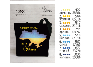 Пошита сумочка Характеристика виробу: -розмір виробу: ширина - 36 см, висота — 35 см. Ширина дна сумки: 6 см -ручки виготовлені з ремінної стрічки, повна довжина ручки — 60 см — (2 шт) - є підкладка всередині - сумка пошита на одне відділення та кишеня всередині - вшита блискавка (застібка) - тканина-габардин (підклеєна флізеліном) або оксфорд (палаткова, водовідштовхувальна) - макет малюнка розміщений на одній стороні сумочки - якісне пошиття
